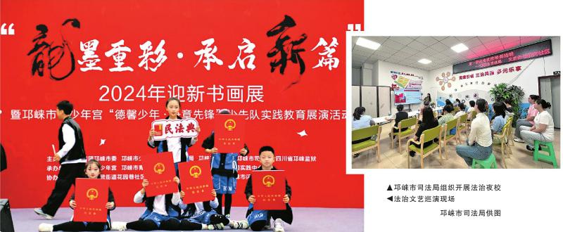 为深入实施青少年“学法筑基”行动,邛崃市选派了110名政法干部担任各中小学法治校长和辅导员,全市61所中小学法治校长和辅导员配备率达100%,并分主题建立法治教育资源库,制作网络安全、远离毒品等22个标准课件,以及个性化法治教育精品课程6件。五年里,该市累计举办检察开放日、模拟法庭、青少年法治启蒙夏令营等主题活动1200余场次,助力青少年扣好法治“第一粒扣子”。邛崃市教育局等5家单位获评成都市青少年普法教育先进集体,3人获评成都市青少年普法教育先进工作者,9人获评成都市青少年普法教育优秀辅导员。邛崃市文昌小学师生自编自演的《模拟法庭“校园欺凌案”庭审》获评四川省校园影视教育成果三等奖,成为校园法治实践的鲜活写照。