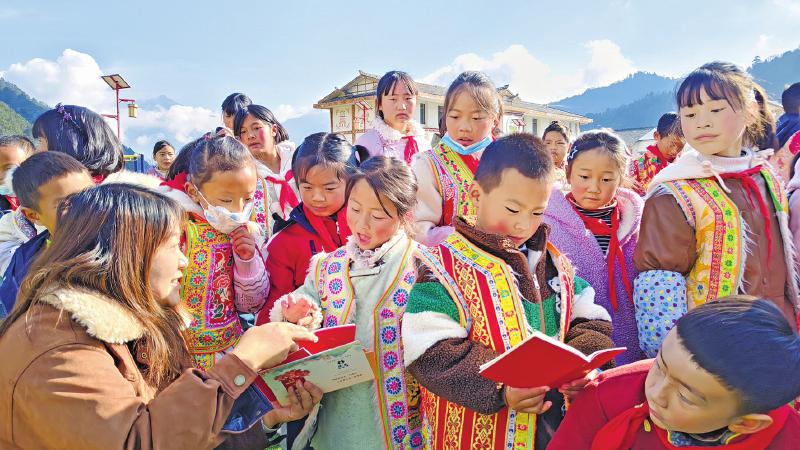 2025年12月,雅安市宝兴县普法志愿者与青少年一起朗读宪法