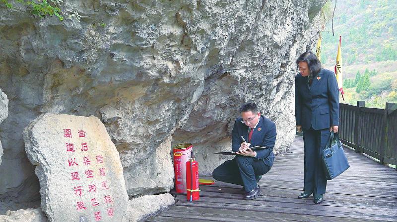 广元市朝天区检察院检察官在明月峡调查消防设施建设。通过公益诉讼履职,推动明月峡古栈道遗址完善消防设施建设