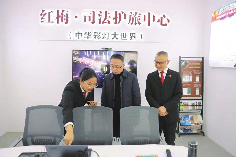 签约仪式结束后,陈昶参观了红梅·司法护旅中心(中华彩灯大世界),深入了解了护旅中心从受理到调解的纠纷流转机制,以及“云法庭”如何借助技术实现线上高效解纷的全过程。