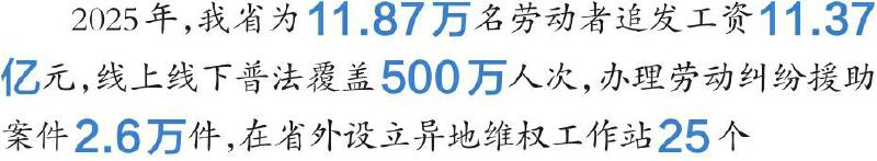 本次行动中,我省持续推进集体协商,全年签订综合集体合同1.46万份,覆盖职工205.6万人,开展新业态行业性、区域性集体协商,覆盖新就业形态劳动者25.2万人,破解新业态维权难题;开展“安薪天府”专项整治,为11.87万名劳动者追发工资11.37亿元,线上线下普法覆盖500万人次,办理劳动纠纷援助案件2.6万件,在省外设立异地维权工作站25个。