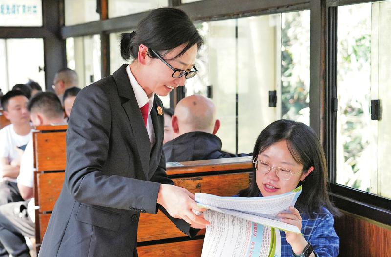 2025年3月25日,石溪法庭庭长李娟与乘客交流 周妤曦 摄