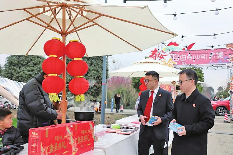 在龙吟集市现场,金堂县法院还设起了“法治年货铺”。这里不售寻常大年货,专送“法治小甜点”。干警们热情地向往来游客及商户发放《古韵今护·法治留芳——“三古”保护指南》《旅游防骗消费者权益保护》等特色普法手册,法官化身“答疑NPC”,为有需要的群众提供“一对一”法律咨询服务。四川法治报全媒体记者 陈博 文/图