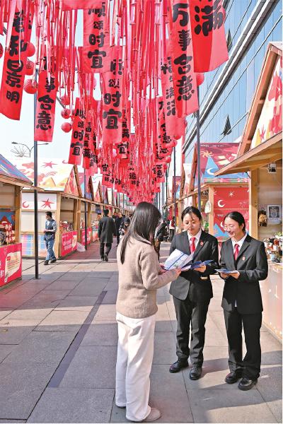 集市一角,一名干警俯身向前,耐心回应着伸手触摸马年年画的小朋友,温柔地递上福字并讲解宣传册里的内容;另一边,法院工作人员主动向同行的游客推介文旅纠纷手册:“叔叔,你们是一家人来旅游的吗?可以看看我们这个手册,上面写了一些旅游常见纠纷的处理办法。”
