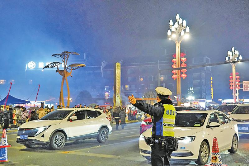 2月16日,除夕夜,峨眉山大佛禅院灯火璀璨,市民和游客焚香祈福,喜迎新年。峨眉公安民辅警们驻守在大佛禅院的各个角落,以坚守为这场新春祈福盛会筑牢平安防线,用“我在岗”的担当换万家团圆的安心。