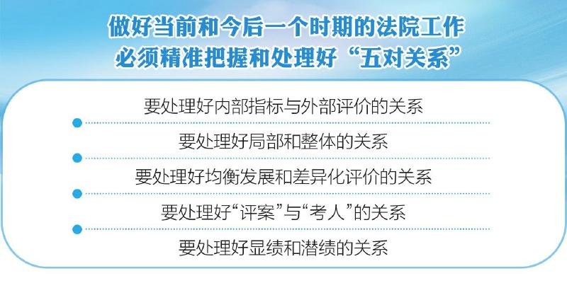 会议要求,做好当前和今后一个时期的法院工作,必须精准把握和处理好“五对关系”,巩固保持审判质量、效率、效果全面达标良好局面,大力攻坚清理积案,巩固拓展类型化纠纷治理成效,继续优化研发“案件码”,加大虚假诉讼打击等专项活动力度。要处理好内部指标与外部评价的关系,把人民群众满意作为最终检验和根本标准,坚持问题导向,从人民群众最不满意的地方改起,更加善于通过公正司法维护公平正义。要处理好局部和整体的关系,牢固树立全省法院“一盘棋”意识,完善“大审管”格局,强化立审执一体化,立足职能,服务大局。要处理好均衡发展和差异化评价的关系,努力扬长补短,推动均衡发展,探索构建差异化评价机制,深化类型化纠纷源头治理。要处理好“评案”与“考人”的关系,坚持“评案”与“考人”相结合,通过深度学习运用“一张网”,实现对法官办案质效“画像”,做到以事察人、知事识人。要处理好显绩和潜绩的关系,既要着力做好当下治、易见效的事,更要有“功成不必在我,功成必定有我”的精神境界和历史担当,做好强基础、利长远的事。