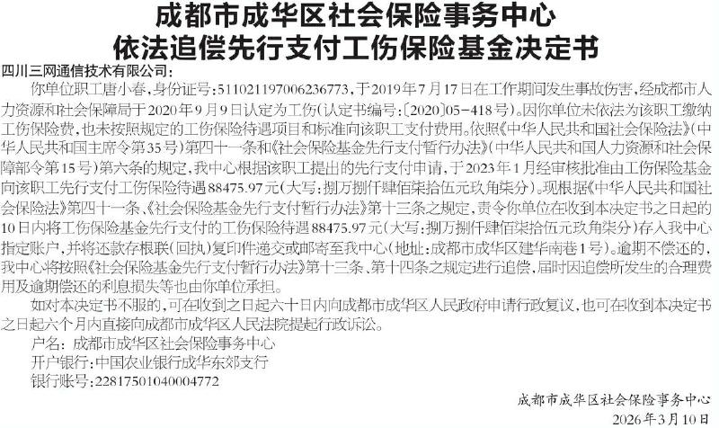 • 成都市成华区社会保险事务中心依法追偿先行支付工伤保险基金决定书