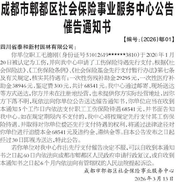·成都市新都区社会保险事业服务中心依法支付工伤保险待遇催告书