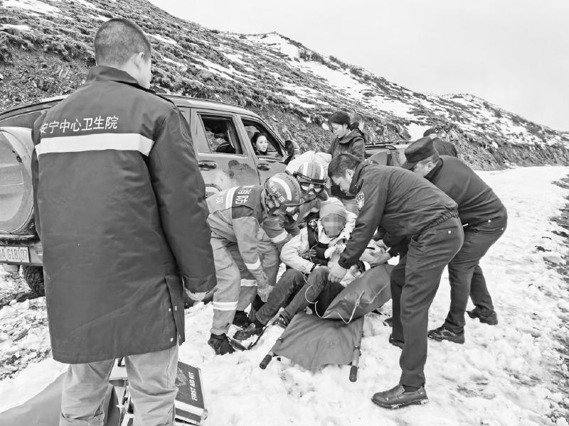 金川县公安局安宁派出所接到求助警情后,民辅警火速赶赴现场,同步联动消防、卫生院等救援力量协同驰援。受持续降雪、路面结冰影响,车辆无法通行,救援人员果断弃车徒步。在海拔4300米的严寒冰雪中艰难跋涉5公里后,救援人员抵达事发地,立即对伤者进行止血、保暖等紧急处置,同步安抚其他被困游客情绪,全力开展转移工作。